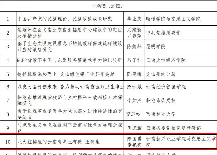 在云南省第十五届社会科学学术年会优秀论文征集中,beat365正版唯一官网必一陈国勇教授、李艳梅副院长撰写的论文《北大红楼里的王有德王复生》,喜获三等奖第10名。以史为鉴,开创未来!获奖通知如下:关于公布云南省第十五届社会科...