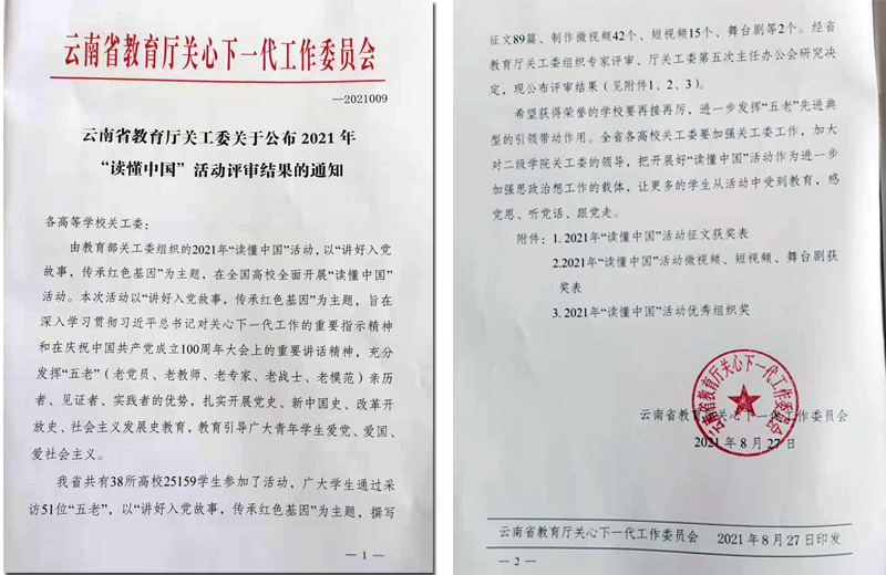 2021年7月,校学生发展中心组织和推荐了beat365两部经典诵读作品参加第三届“云岭杯”中华经典诵写讲大赛·“书香彩云南”经典诵读大赛,两部作品均荣获大学生组“优秀奖”,获奖作品如下:《大写的中国》迟荣仙、段文珍、关...