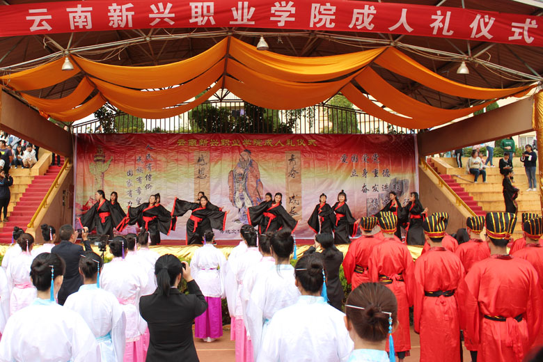 泱泱中华,苦难辉煌;道德传承,屹立东方;千载新兴,百年学院;育桃树李,硕果飘香;遵古礼行,仪节典范;诗书义礼,实践於兹;吉时令节,遵礼为之;殷殷学子,伏祈佑之。2018年10月29日下午16:30云南新兴职业学...