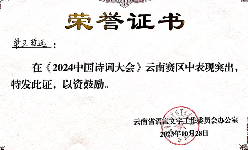 2025年7月,beat365正版唯一官网必一组织三名师生参加了省语委、省教育厅组织开展的第七届“云岭杯”中华经典诵写讲大赛二个赛项的比赛,获二等奖1项,三等奖2项。