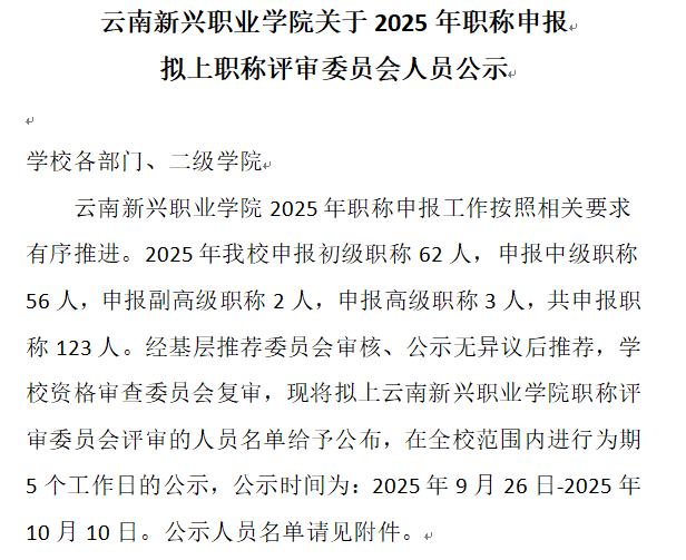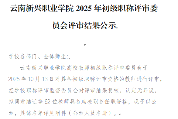学校各部门、全体师生:beat365正版唯一官网必一高校教师初级职称评审委员会于2025年10月13日对具备初级职称评审资格的教师进行评审,经学校职称评审监督委员会对评审结果复核,认定无异议,拟同意陆迁等62位教师具备助教职...