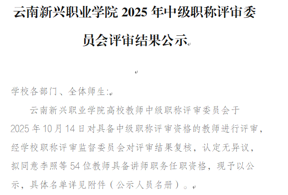 学校各部门、全体师生:beat365正版唯一官网必一高校教师中级职称评审委员会于2025年10月14日对具备中级职称评审资格的教师进行评审,经学校职称评审监督委员会对评审结果复核,认定无异议,拟同意李照等54位教师具备讲师职...