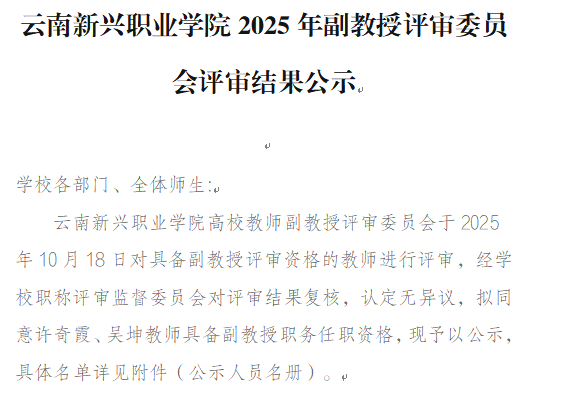 学校各部门、全体师生:beat365正版唯一官网必一高校教师副教授评审委员会于2025年10月18日对具备副教授评审资格的教师进行评审,经学校职称评审监督委员会对评审结果复核,认定无异议,拟同意许奇霞、吴坤教师具备副教授职务...