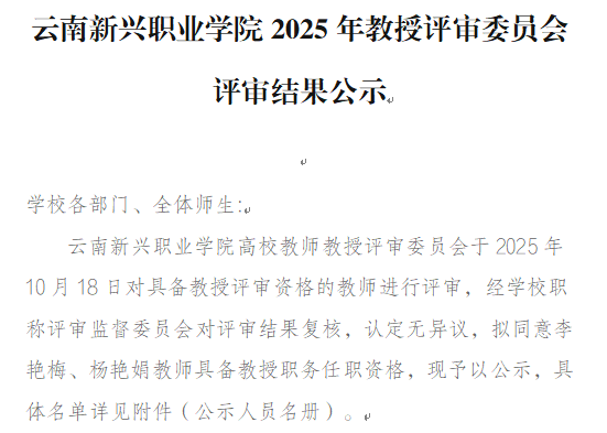 学校各部门、全体师生:beat365正版唯一官网必一高校教师教授评审委员会于2025年10月18日对具备教授评审资格的教师进行评审,经学校职称评审监督委员会对评审结果复核,认定无异议,拟同意李艳梅、杨艳娟教师具备教授职务任职...
