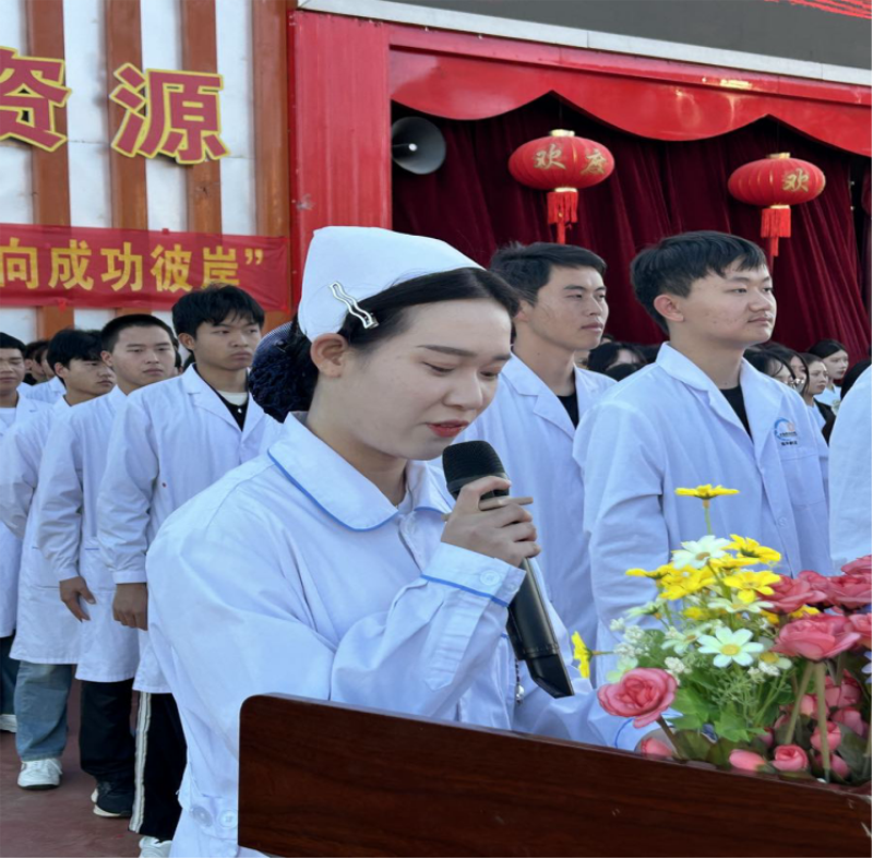 同时,在开幕式上来自2023级高职护理1班的王丽娜同学作为参赛选手代表郑重承诺,在比赛过程中将严格遵守比赛规则,尊重评委、尊重对手,认真对待每一段赛程。她表示,无论比赛结果如何,选手们都是胜利者,因为在这个过程中收获了知识、技能和成长。同时,她也呼吁同学们将大赛中培养的工匠精神带回日常学习和生活中,追求卓越、精益求精,并向那些还未参与大赛的同学们传递技能的魅力。