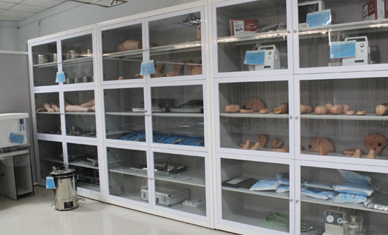 2.外科护理实训室配备有万能手术床、无影灯、吊塔式心电监护仪、中心供氧装置、中心负压吸引装置、电动吸引器、呼吸机、手术对接床、压力蒸汽灭菌器、微波炉、抢救车、手术室各种常见器械、看片灯,能满足外科护理实验教学的需要。