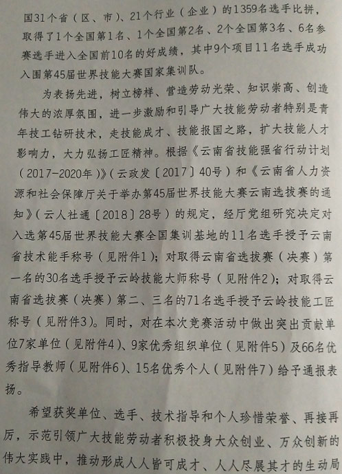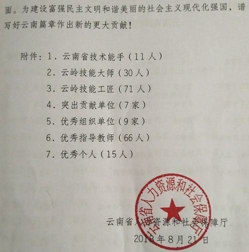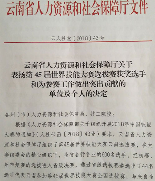 近日,云南省人力资源和社会保障厅下发《关于表扬第45届世界技能大赛选拔赛获奖选手和为参赛工作做出突出贡献的单位及个人的决定》(云人社发〔2018〕43号),李艳梅副院长荣获“