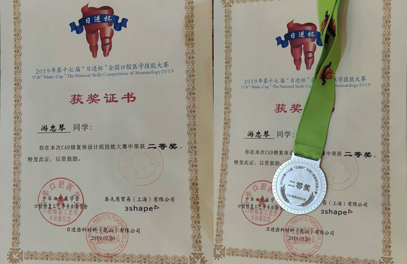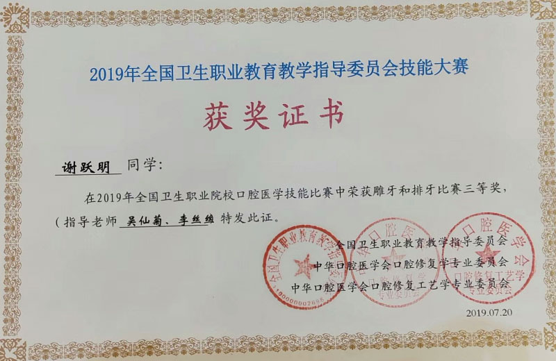 本次大赛于2019年7月20日在山东省枣庄职业学院举行,参赛选手分别来自全国76所本科、高职大专、中专院校,共计196人参加比赛。在学院各位领导的大力支持、指导教师的精心教导、参赛选手的辛苦付出下,beat365谢跃明同学荣获雕牙和排牙比赛三等奖,游忠琴同学荣获CAD修复体设计组技能大赛二等奖。