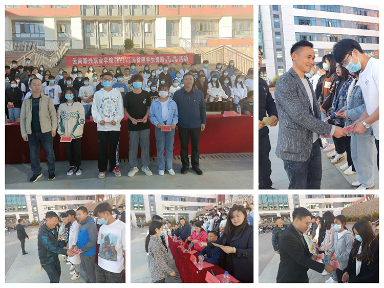 校领导、赞助企业领导为受到爱心资助的同学发放生活补贴,并合影留念。