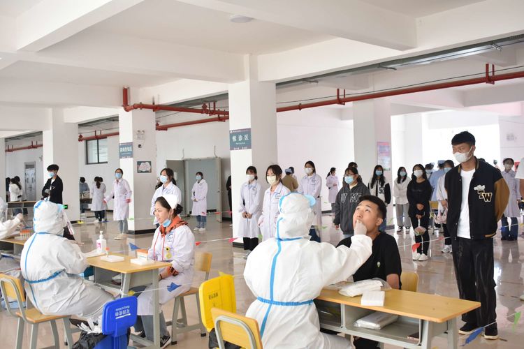 经过精心准备和严密部署,2022年5月5日13:30,核酸检测工作在护理学院、药学院和医学康复学院同时进行。共设采样区3个,采样点28个,分别为:2号教学楼一楼8个采样点、8号教学楼一楼10个采样点、9号教学楼一楼10个采样点。统一安排扫码登记员24人、采样员24人、引导员24人、采集点负责人12人、联络员6人、志愿者60人。各采样点均落实“1米线”间隔要求和体温检测、戴口罩等防护措施,保证人员单向流动,避免人流、物流交叉。