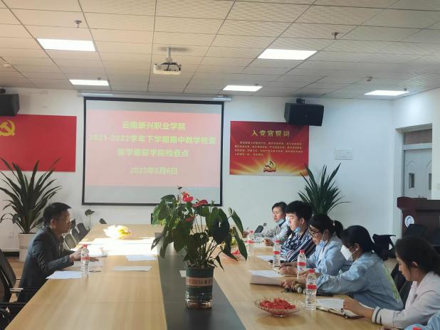 会后,在各组组长带领下,参加检查人员立即奔赴护理学院、药学院、医学康复学院、教务处等检查现场进行了严格细致的检查。本次期中教学检查的内容共有十二项:一是课堂教学质量检查。检查各二级教学单位的听评课记录,在每次听评课时,《云南新兴职业学校课堂教学质量评价表》完成情况,检查学生到课率,检查任课教师考勤记录以及根据学校教学日历,检查教学进度等;二是教学规范性文件检查。检查教师教案、教学大纲、实训指导、实训报告、多媒体课件等规范性文件的编写和制作情况;三是教研室工作手册。各教研室教研教改、教研室工作计划等开展情况检查;四是教师论文发表情况;五是教学管理情况。各二级教学单位教学计划、常规教学管理开展情况、师生反映的问题整改和落实情况;六是期中考核完成情况;七是实验实训情况。各二级教学单位实验实训室使用情况、实验实训课堂开展情况、实验实训器材、耗材使用登记情况、实验实训设备管理维护情况。检查实验实训仪器设备管理制度执行情况、仪器设备台账情况等;八是资料归档工作。教学文件、会议记录、技能大赛等相关活动资料整理归档情况;九是校本教材建设情况。参与教材建设的主编、副主编、编委情况,校本实验实训指导、习题集等情况;十是教学信息化平台使用情况;十一是本学期教学任务与人才培养方案是否相符等情况;十二是教学诊断与改进推进情况、科研项目及骨干教师履职推进情况。