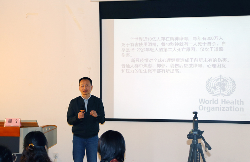 周宁教授首先分析了一组数据,全世界近10亿人存在精神障碍,让大家了解全球的心理健康状况不容乐观,人类已经从“传染病时代”进入“精神病时代”。接着他从四个方面进行了讲解:一是学生心理特点怎样判断大学生的心理健康;二是大学生常见的心理问题;三是如何干预学生出现的心理危机;四是教师心理健康的维护。