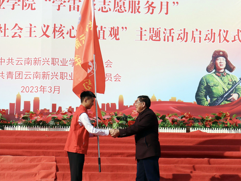 学校董事长关祥祖同志向学校志愿者服务队代表授旗,勉励他们弘扬雷锋精神,践行社会主义核心价值观,让“奉献、友爱、互助、进步”的志愿精神在学校落地生根。