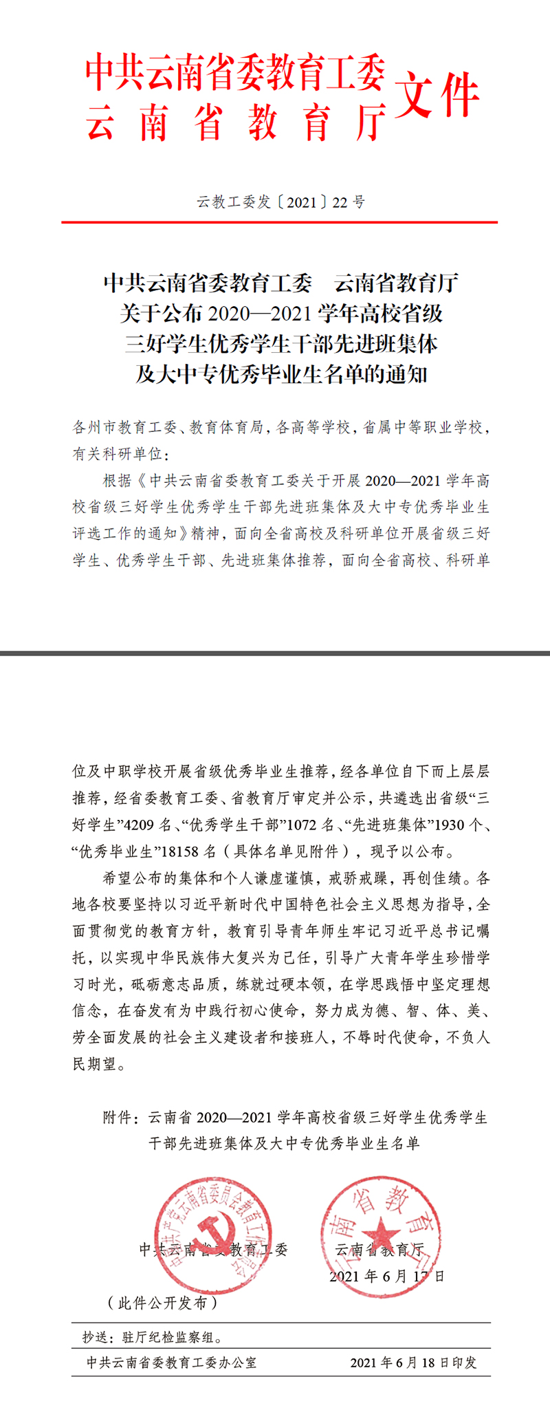 【喜 报】:beat365正版唯一官网必一2020-2021学年省级三好学生、优秀学生干部、先进班集体及大中专优秀毕业生名单揭晓
