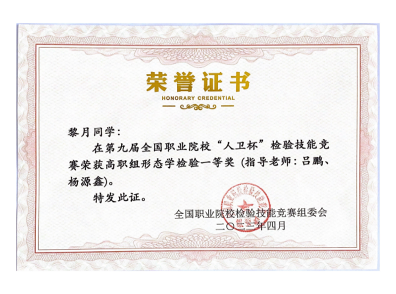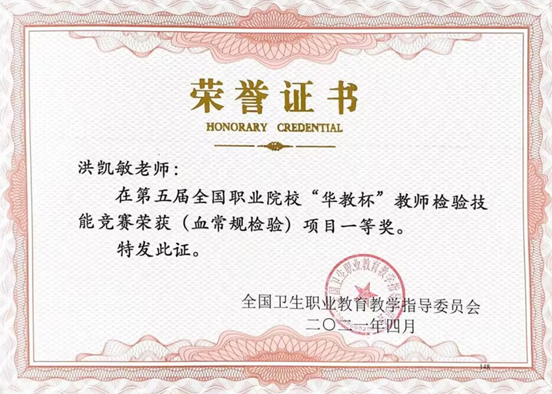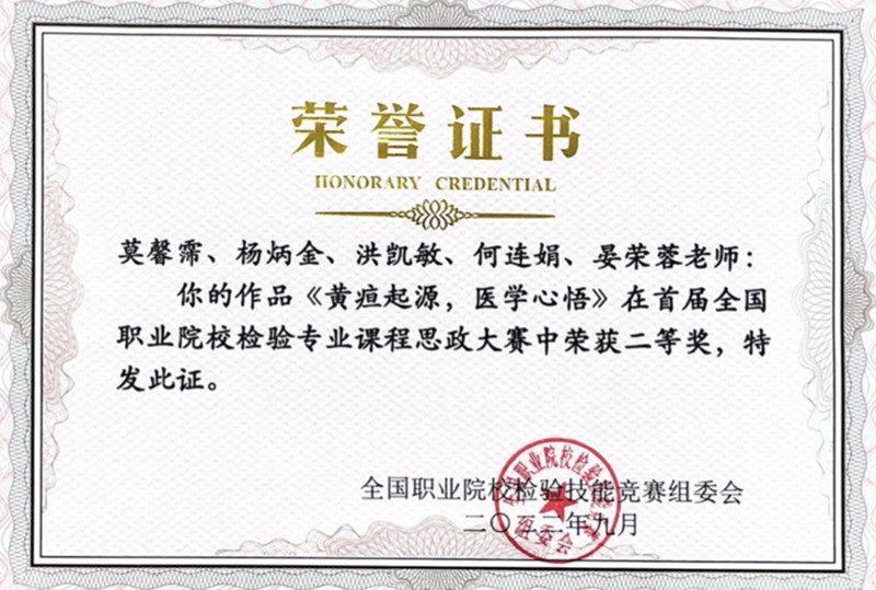 2021年beat365医学检验技术专业教师洪凯敏、张显明、何连娟、杨源鑫参加第五届“华教杯”全国职业院校教师检验技能竞赛,分别荣获一等奖、三等奖以及优秀奖;2022年beat365医学检验技术专业学生参加全国职业院校首届检验科普作品大赛荣获一等奖1项,二等奖1项,三等奖7项;2022年医学康复学院教师莫馨霈、杨炳金、洪凯敏、何连娟、晏荣蓉老师参加首届全国职业院校检验专业课程思政大赛中荣获二等奖;2023年医学检验技术专业在全国职业院校教师检验技能大赛荣获一等奖1项,二等奖1项,三等奖3项;
