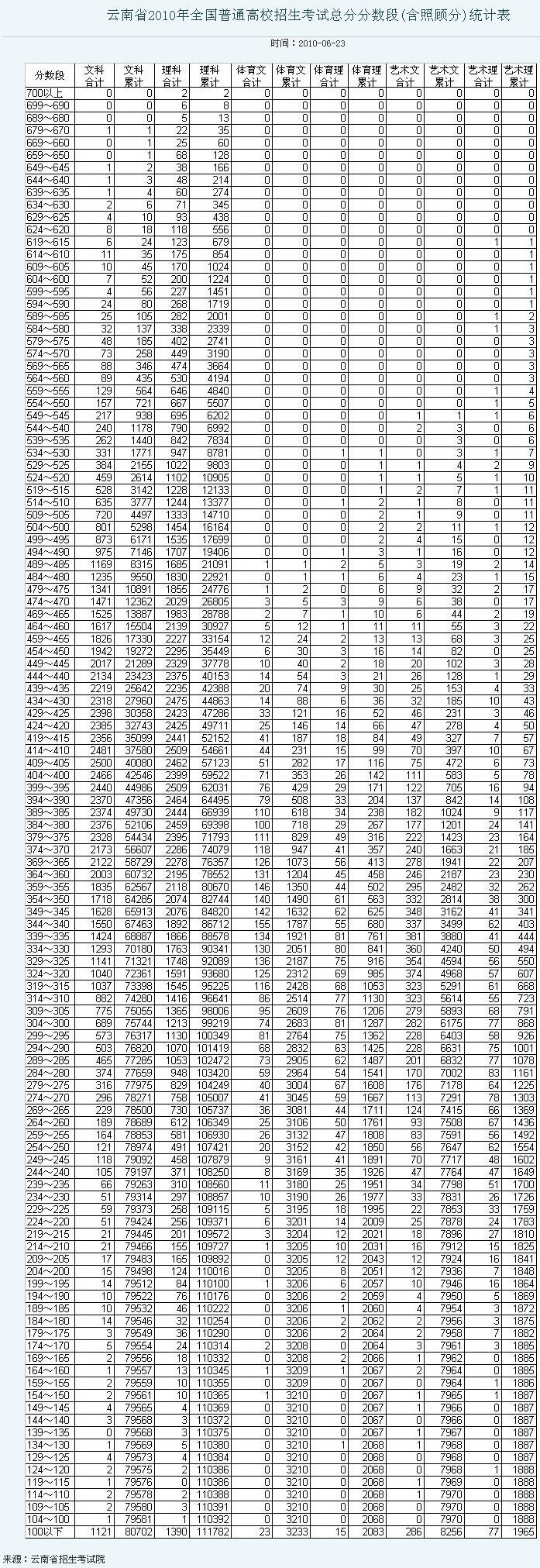 云南省2010年全国普通高校招生考试总分分数段(含照顾分)统计表